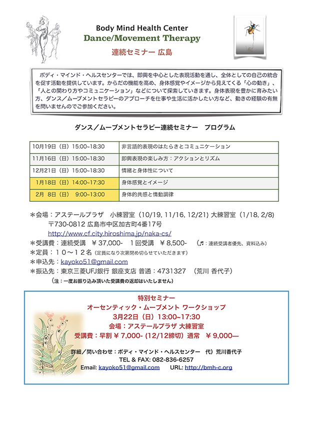 問い合わせ/申し込み:ボディ・マインド・ヘルスセンター Email: kayoko51@gmail.com